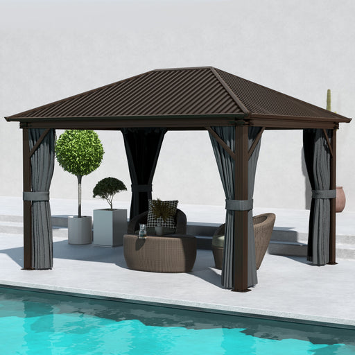 Hardtop Gazebo 10x12 Aluminum Frame Metal Roof with Curtains Netting for Garden Patio Backyard Brown
