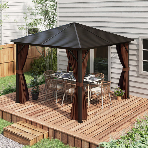 Outsunny Permanent Metal Retreat: 10'x12' Hardtop Gazebo with Netting Curtains, Brown Roof Canopy for Gardens